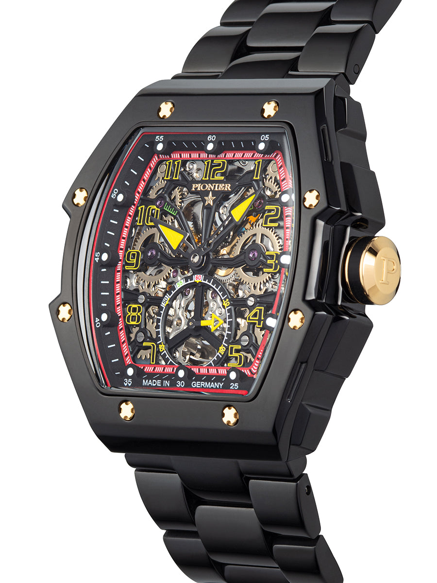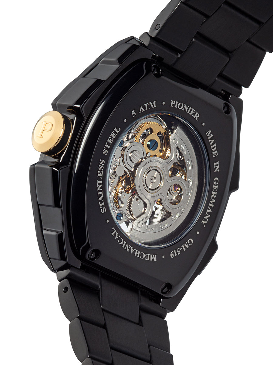 Milano nga Pionier Germany është mishërimi i mjeshtërisë me dizajnin e tij transparent të skeletit mekanik automatik dhe cilësinë e lartë. Dizajni i skeletit i lejon admiruesit të bie në dashuri me ingranazhet madhështore të mekanizmit.