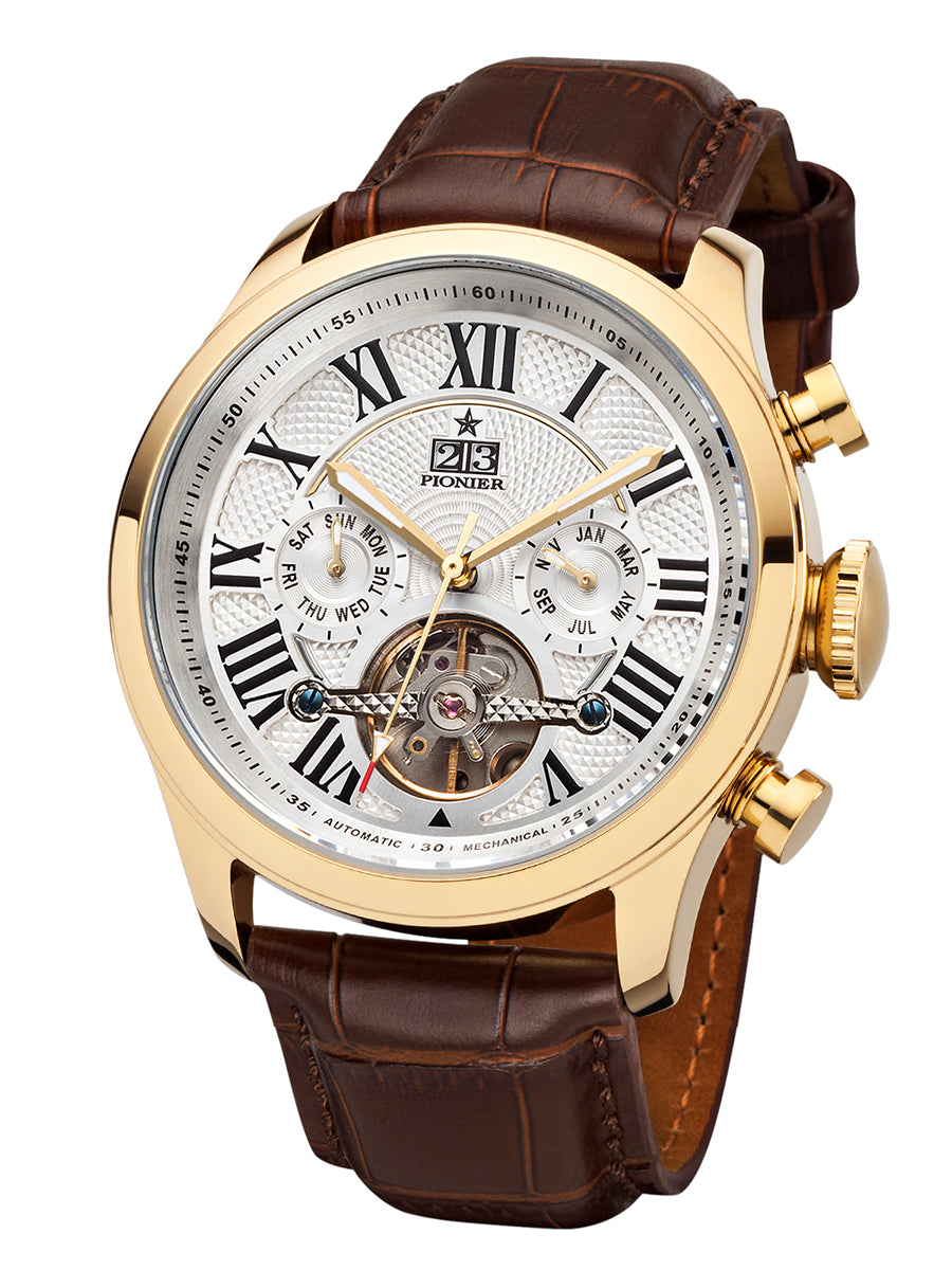 Ora me kalendar automatik Havana Pionier është prodhim unik. Gjëja e parë që bie në sy është dizajni i rafinuar me një numërues sektori dyngjyrësh, i brendshëm është i gdhendur me një model unik, dhe fusha e jashtme është vendi ku vendosen rubinet e vërtetë 0,05 karat.