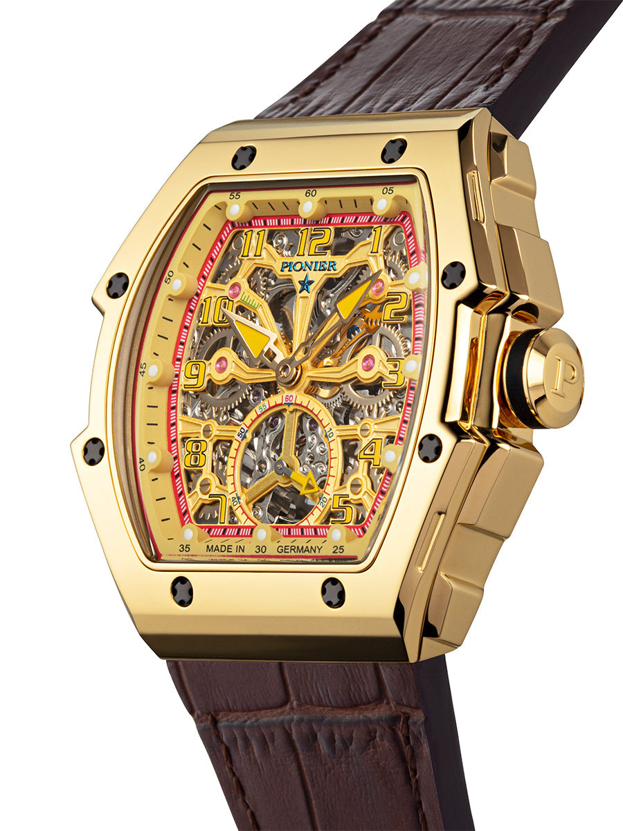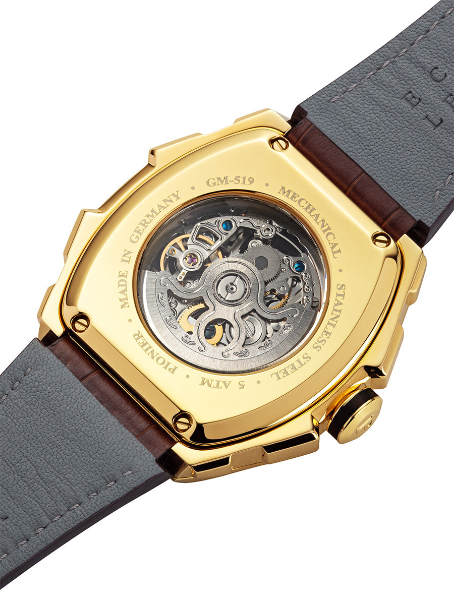 Milano nga Pionier Germany është mishërimi i mjeshtërisë me dizajnin e tij transparent të skeletit mekanik automatik dhe cilësinë e lartë. Dizajni i skeletit i lejon admiruesit të bie në dashuri me ingranazhet madhështore të mekanizmit.