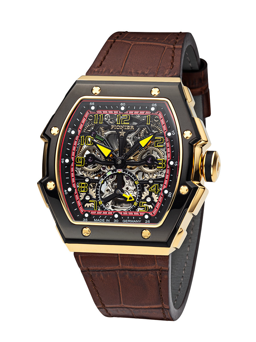 Milano nga Pionier Germany është mishërimi i mjeshtërisë me dizajnin e tij transparent të skeletit mekanik automatik dhe cilësinë e lartë. Dizajni i skeletit i lejon admiruesit të bie në dashuri me ingranazhet madhështore të mekanizmit.